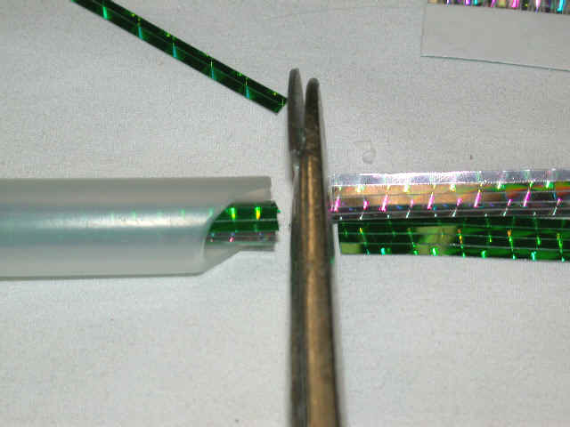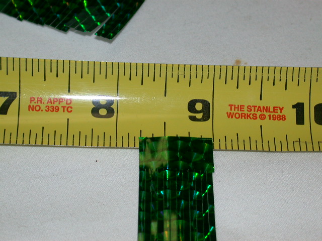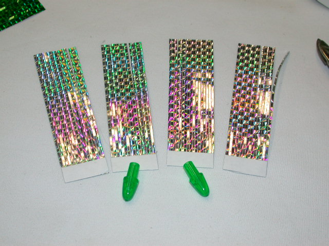 Dividing the Mylar that already has the double faced adhesive. 2. Two pieces of fringe tape, soon to be four, you'll need to peel off this backing. 3 . Enough material to do 4 attractor flies 4. Circumference of bullet is 3/4, DO NOT precut the Mylar fringe to this size. |