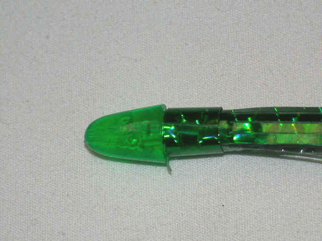 chains, crimps are available in my hardware kit. 4. A simple clinch-knot is the easiest to tie, I use a Trilene knot and moisten 5. Use Cortland's "Bite Guard" Hard Mono to make your meat rigs. This special leader material holds up far better than any regular mono line we tried. 6. The collar Mylar collar, or over-wrap tape adds a finished professional look. Then to keep the collar tape from lifting, use a 1/4' piece of clear (non-frosty) Scotch Tape. This 1/4" specially cut clear tape is available in my hardware kit. 7. This is not rocket surgery, or brain science. A little off here, or there ain't gonna make one iota's difference to the fish! 8. Make sure your skirts are bloused out and separated, especially before you set lines. By not having the Mylar pinched against the leader, this frees up your meat head. 9. There is no wrong way to do this, so don't worry about a inch here, or a 1/4 of an inch there. The fish do not carry a measuring tape. |