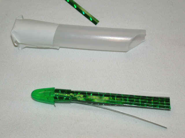 Look closely at this photo. This is a "stock in the package" brand new twinkie fly, it's starting to separate slightly, with some double-faced tape stuck on it. This will not happen if you wrap the collar tape with an overlay of scotch-tape. 10. Overall length is around 2 3/4 inches and this photo features your guide tool for making all your flies the same length. I prefer 3 inches from the tip of the bullet head to the end of the fly, many use 2 1/2 inches too. So, use the length your like. 11. Tape over one of the measuring tool. Trim off at what you want the length of the fly to be ( 2 & 3/4 inches). Please keep in mind this is not rocket science and a little shorter, or a little longer is perfectly is O.K. 12. Trim cutting guide tool to preferred distance. Although you'll have to trim this tubing to size, it will insure a pro job in all flies being uniform. |