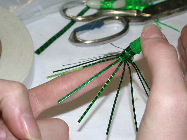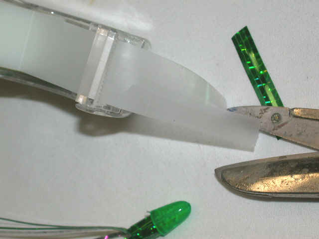 I trim the cutting tool at a 45 degree angle, this is optional. 14. Overall measurement of my cutting tool is 2 & 3/4 inches 15. Trim attractor fly to the correct length 16. Snipped off Mylar fringe tape |