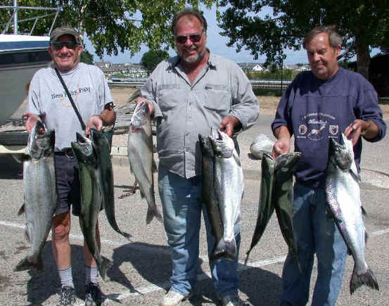 Although our fishing team won the Pepsi Super at Alpena this year and some would think it would be the most memorable day of 2004 – it did not make the top three. This photo taken at 11:00 a.m. on August 28th is the most memorable day of 2004. The boat ballast on the right happens to be my boss here at work and I have an arm around my fish-slaying daughter. The scene follows like this – five or six fish are in the cooler and the captain is steering straight up-wind in 2-3 foot waves when the starboard dipsy takes off. My daughter is napping (or should I say waiting for some excitement) when the rigger on the same side takes off and the boss grabs that rod too. I yell down to my daughter that we have a double on and she comes running up the steps out of the cabin. Just as she reaches the top step, the port dipsy starts jumping and she maneuvers it out of the holder (it’s a 12 ft dipsy and it has taken her a couple of years to learn the leverage needed to take get that baby out of the holder). I yell at the boss to hand me the rod with the smaller fish and as I am reeling and trying to steer into the wind, the center rigger takes off too! Talk about pandemonium while trying to steer into the wind. A fifth rod takes a hit but no one is home (like somebody could even get to it.) Captain Craig says screw it and by now I am at least sideways to the wind and let the steering wheel go to concentrate on all four fish. The net outcome – all four landed with big grins from ear to ear on all 3 of our faces. The photo tells the rest of the story and memories are really made when you can take others out fishing who rarely have a chance to go. The grin on my bosses face was almost priceless as he tries to figure out how to reel in fish with a rod in each hand. This all occurred while fishing a port I had never been out of and a heartfelt thank-you and Merry Christmas goes out to all those on this message board who steered me to a fantastic place to fish....Capt. Craig O.