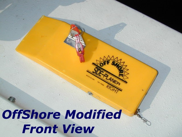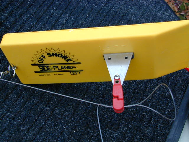 better. In-Line Planers or Regular Planer Boards? Why chose the in-lines over the standard dual planer board? Because the in-lines offers advantages like the surging or jigging action the little boards impart to the lure. Next, they'll run in rougher water the standard board which can flip over and cause you a world of grief when it turns into a deep six and heads for the bottom. When a fish rips into the in-line planer it's a better hook set because you're directly straight lined immediately to the fish, plus the constant drag of the in-line planer the hook will stay in a fish better too, especially on the skyrocketing Steelhead that won't stay in the water. I've used the Yellow Birds, Willie Boards and the Roach Board and they all will work fine, however, I've had my best luck with the Off Shore Side Planer that features tremendous rough water stability. But, they'll need the modifications below to attain pro-caliber results. Modifications (1.) The stationary Mini Release needs to be changed to one that moves on a split ring. This will assist in the hooking and mainly the board won't drag near so hard when you're pulling them in. I've used the large split rings that come with the stock board. The newer version of the board comes with a plastic arm and the older ones used metal with a tab of metal the hold the release outright. Tip: if they're the metal arm, just break off the tiny upright tab of metal and insert the split ring in the exposed hole. (2.) The rear tow point needs to be moved from in the middle of it's side to the lowest point on the rear of the board and in the middle. This can be done with just a pair of pliers but it's better to drill pilot hole. (3.) Trim off 1 inch of lead on the front of the flat bar of lead (the keel). This will allow the board to ride higher in the front and impart more of a skipping or jigging action to the lure. (4.)