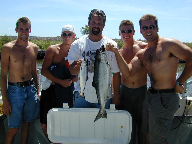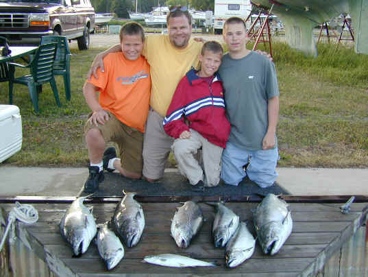 7/3/01pm  The afternoon guests were "My 3 Sons" of Mark Rumpeki.  Tommy, Chad and Jayce had more than enough action on Salmon to make anyone, pleased! The boys boated 6 Large King Salmon and a Brown Trout pushing 14 pounds.  While pulling lines Mark landed a King exceeding the 20 pound mark after a long and exhausting battle.  Chad landed a couple of Kings in the high teens, while Jayce had the bragging rights to the lunker 14 pound Brown Trout.  Not to be left out, Tommy pulled his share of the load, landing a couple of hard fighting Kings.  A great time was had by all on a calm Lake Michigan.