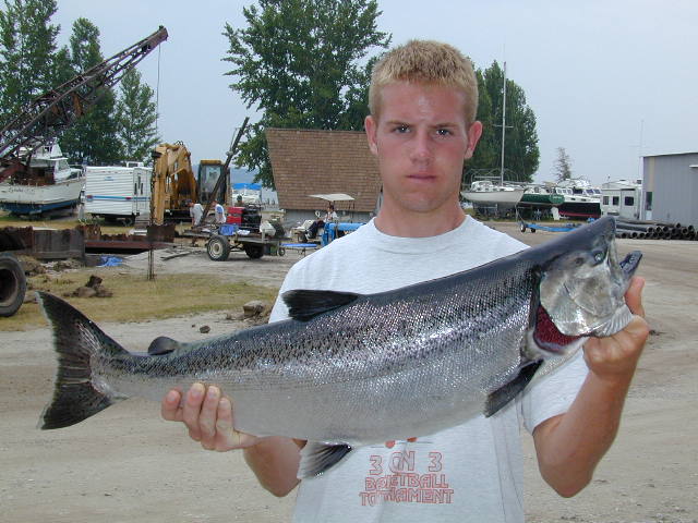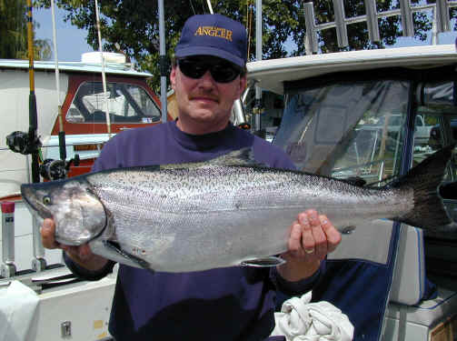 7/21/01   Today, we started the first leg of our Salmon Seminars.  John, Dan, Bob, Jeff, Craig and Adam were my esteemed guests.  These anglers were on the job and never missed a downrigger hit.......fantastic!  We boat all 5 interested finny creatures that made the fatal mistake of chewing on our lures.  The only strike that was missed was on a high diver.  The body count was 3 chunky Lakers, an immature King and the nicest fish was a 10 to 12 pound cart wheeling Steelhead.