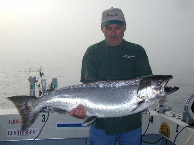 A very foggy morning prevented meant a slow trip to the fishing grounds, just north of the Manistee Harbor in 170 to 300 feet of water.  During the limited time spent over the productive area (3 hours), we landed 5 Salmon to 18 pounds and 1 Laker on dodger-fly and Bechhold Flashers, as some in the group found newfound confidence in attractor style fishing.  The fish were coming at 70 to 80 feet down.