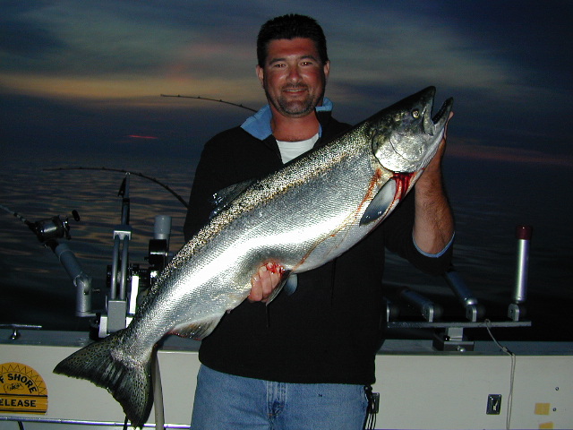 7/20/01   Fished a very short evening on 7/19/01, by the time we finished boat maintenance and gassing up.  Dropped lines on the fish around 7pm and we pulled at 9:30pm to go in.   During the two and a half hours we had 10 to 12 hits and landed 5 Kings (a skipper was released) to about 20 pounds, small Laker and a dandy 10 to 12 pound Steelhead was expertly landed by Capt. Mark Pefley.  We had "reel decent" action for such a short period of time.  Also, boat traffic was light, which improved the catching.             Click here for Mark's beautiful Steelhead.