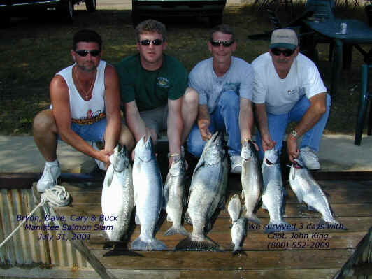7/31/01  The Cary, Dave, Buck and Bryon 3 day Fish-a-Thon ended today, and I'll be sorry to see this fine group of dedicated fishermen leave....FACT!  The team work, sharing and camaraderie displayed by "Team Smooth" is a seldom seen thing in today's world.  Now, here's something to pay attention too; they boated every fish and didn't miss one strike, reel incredible!