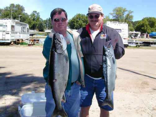 I fished with the Browns last year and the catch in 2000 far exceeded what we did today.   Yesterday's blow has scattered what fish, we did have off Manistee.  Spotty best describes the action the fleet experienced.  Click for photo of Dale & Dennis Brown