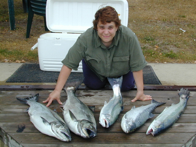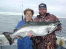 7/23/01  My guests today were Doris Colton and her father, Dan Wright.  While we didn't exactly "set the world on fire" with a super heavy box, we did manage to hook and land 5 respectable fish.  The catch consisted of 2 Kings to 20 pounds, a couple of decent Steelhead and a 8 pound Coho. Click for catch photo