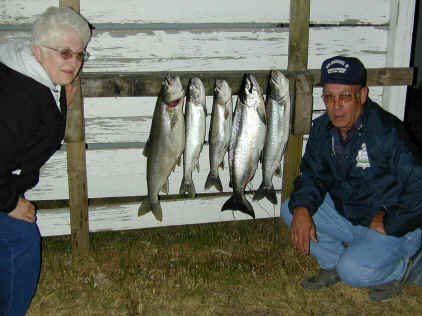 7/2/01pm  I had the great opportunity to share an evening on Lake Michigan with Betty and Ray Hickman.  The fishing was not red hot, but we managed to bring 4 Lake Trout to 11 pounds and a 12 pound King to the net.  Ray's expert rod handling and alertness made all the difference in the world, by not missing hits or losing fish.  Betty was a sheer joy and light conversation made up for the lack of a heavy fish take.  All in all, it was a pleasure to fish with these folks. Click for Betty & Ray catch picture