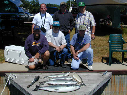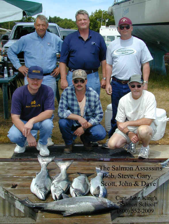 7/15/01  Yesterday, we started another Salmon School  with Bob, Steve, John, Dave, Scott and Gary, soon to known as the "Salmon Assassins."  We fished north away from the main pack and had 9 hits and boated 4 Kings from 10 to 18 pounds and a Steelhead.  Our action was decent, considering we didn't drop lines until at least 7:45am.  The misses included 2 double headers!  Click for group photo