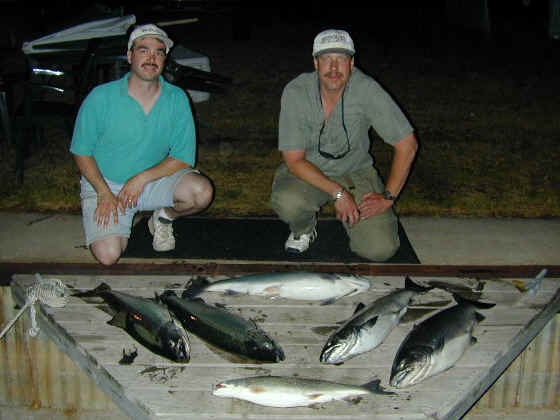 7/6/01  Fished today with 2 Jeffs, Mark, Leon, John and Joe in "Capt. John's Salmon School."  I thought everything went amazingly well, considering we couldn't get off the dock until 6:30pm, because of rough seas and threatening thunderstorms.