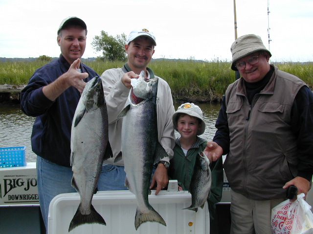7/30/01  Today's success doesn't show in the numbers of fish that we boated, but the first-rate time that was shared by all.  Cary, Bryan, Dave and Buck were once again my honored guests.  This team has it all!  They set lines, net fish and are probably the most experienced and helpful folks to ever set foot on my boat in the 14 seasons that I've owned this Cherokee.  It's reel easy to brag this group up, because I'm amazed at how fast they caught on to my program.  Oh, Yeah, we did end up boating 4 Kings to maybe 25 pounds and a handsome chromer Steelhead.