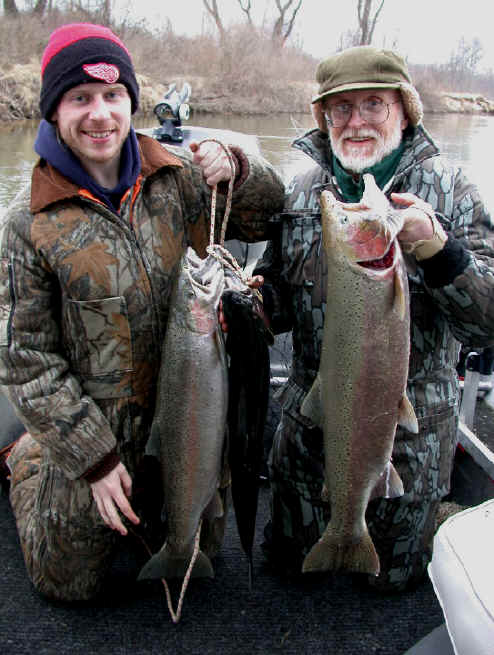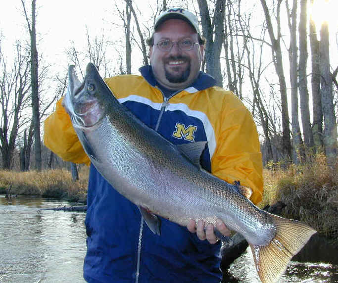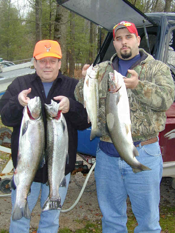here for Barry and Rich's most excellent mug shots 11/21/01 Getting ready for the annual Thanksgiving fishing with Barry Pines is at the forefront today. Tying up loose ends on the Cherokee winter storage project is what I plan to accomplish. Steelhead fishing in the river should be good. 11/20/01 I've been on a 2 day downstate quest searching tackle outlets for the 4 hook model of the T-4 Flatfish. I found some new colors that should work fine in the Big Manistee River. I'll be returning to Manistee County early tomorrow morning. Angler supreme Barry Pines and friends will be my esteemed guests for the next 3 days of the Thanksgiving weekend. 11/16/01