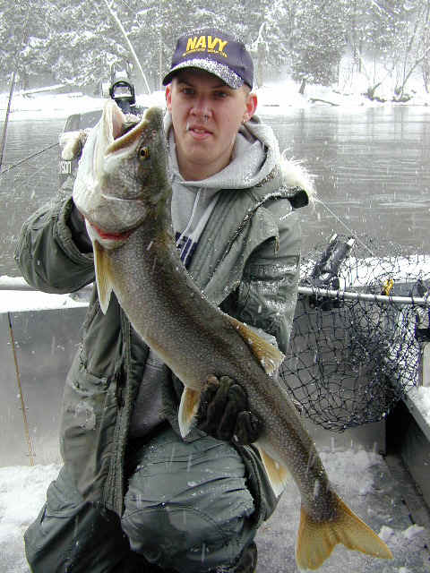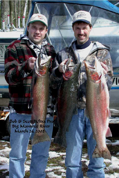 jury rig the flap-gate valve on the jet-pump. 3/25/02am Woke up the Cherokee from it's very long winter's sleep. I took it home from the heated storage building in Wellston I use. I'm on the river everyday this week, so check back later for results. My guest today is Gene Commire and I'm hoping the brutal butt whipping the Steelhead took over the weekend don't completely shut the fish down. We need a few Steelhead to strike.....reel fact! 3/24/02 I went to the zoo at the High Bridge boat launch on the BMR today, at about 3:30pm. There was at least 25 boat trailers with no place to park. The word "heavy traffic" doesn't describe what I saw. Mailed several lure and snubber packs in Manistee also. Let all hope, the winter-like conditions we've been experiencing will break towards spring reel soon! 3/23/02 Catching up on this weeks tackle orders and a trip to the Post Office is in store for me today. My 28 foot Cherokee comes out of it's winter storages long nap. Next weeks weather in Manistee County looks much better that what we've experienced this week. They're calling for temps approaching 50 by next Saturday. 3/22/02