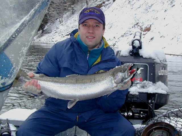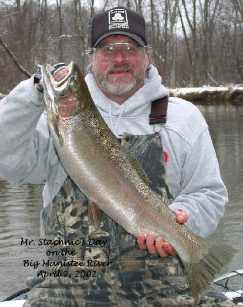 here for Bob's super trophy 3/26/02am I'm fishing today with Bob, the winner of the photo contest who won this trip. We're not gonna start fishing until at least 9am, because of the recent cold spell. While I'm not going the serve any cheese with this whine, I'm at the end of my rope when it comes to this prolonged wintry weather we're experiencing this March. I'm not going get snow blindness, or willing suffer from hypothermia in quest of Steelhead on the Big Manistee River anymore this year. I hope my sentiments echo yours, because this winter stuff has lasted way too long! 3/25/02
