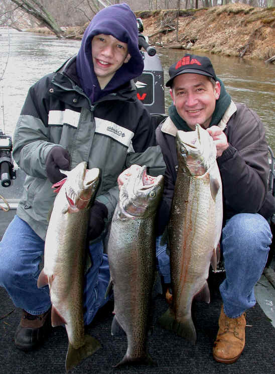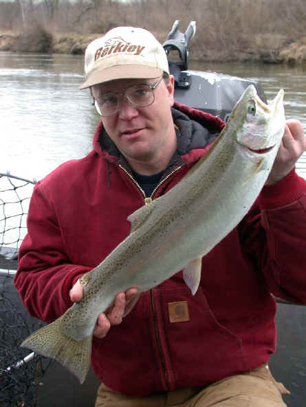 with. 4/4/02 Today was not my day! Although, we had 2 line ripping strikes, neither one stayed hooked up for very long. My guests were Pontiac Fireman, Kelly O'Brien and his 10 year son, Patrick. Kelly was more than nice enough to bring his "famous" pineapple upside down cake, but the Steelhead weren't benevolent to us at all. We fished from about 8am until noon, and slow fishing meant, I wasn't going to push Patrick's patience switch to the limit. Then my brakes let go at the boat ramp, just to make my day even more miserable, not to mention the $$ repair bill. 4/3/02