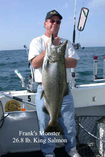 here for tips, techniques and area fished on 9/29/02 9/28/02 Andy S. and 3 young boys were my guests for today's cancelled trip on Lake Michigan. 35 degrees at 7am with a 20 mph wind, plus the youngsters had no heavy winter coats, so I put this trip off until tomorrow. Three frozen "kidsickles" isn't my idea of how to win friends and influence people! Made it over to the net pens at the Little Manistee, and they were crammed full of adult Kings, or Chinooks 9/27/02 Never made much beyond the pier heads this morning, as 2 to 4 seas (and building) dashed any hopes of a trip to deeper waters. So, we made a lap around the harbor without any takers and put the boat back on the dock. 9/26/02 Mr. Don Van Stoyk was my guest for today's Lake Michigan semi-fruitless search for Steelhead. Lack of any decent water temperature is the problem off Manistee now (too warm, 63 degrees to a 100 feet). Even over 700 feet of water, down temp is over a 100 feet down. Also, it didn't help our box much, when we missed the first 4 opportunities and we only ended up with one Steelhead. I got a better plan for tomorrow's effort, check back to see if I figured out what needed to be done? 9/25/02 Going to ready the boat for tomorrow's mission with Don Stoyk and do general late season maintenance. Adjusting to a surface (top 30 foot) fishery means, stowing all the flashers, J-Plugs, dodgers and flies. Spoons will be the food of choice if I can located the mother lode of Steelhead. 9/24/02 If the weather allows, I'll be fishing on Lake Michigan this Thursday, Friday and Saturday. Steelhead and next year's Salmon will be the name of the game. If the fish can be located, the catching can be beyond fantastic. A few years back, we boated 28 fish in less than 3 hours, dock to dock! 9/22/02 A severe cold has me laid pretty low, so low, I'd need a step ladder to crawl over a dime. No updates for yesterday, or today are available. Hope to feel better soon, because I'll be fishing this week. 9/20/02 The party is pretty much past over, as far as the Salmon for the 2002 Lake Michigan season is concerned. I'll be fishing next week (weather permitting), and the main focus will be Steelhead. Late September and early October offer some of the best fishing of the year when adult silver bullet Steelhead begin their annual fall run. Look intense limit catch action near the surface (top 40 feet of water) over depths ranging from 400 to 600 feet. 9/19/02 Made stupendous progress in my