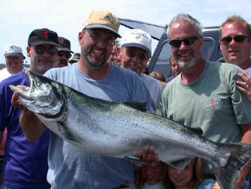 1. The best catch was caught slightly south of Manistee (10's to 12's) on the "shelf" 2. Free sliders and mono high divers took all my fish. 3. Even non-fish eaters raved about Capt. Mark Pefley's "Famous Fish Boil" 4. A no show of "Wet Net" caused "Never Enough" a lack of a team member 5. Bang-a-Rang took big fish honors with a 26 lb. King and the best catch awards 6. A number one Fishlander in the yellow-blue dolphin took all my fish 7. Out of town winning boats need to contact me at: kingscharter@yahoo.com 8. The winner shared all info and at all times from what I could gather 9. I weighed in 54 pounds solo in 4 fish, but I ran 9 rods and had disqualified myself, because I was a on charter and didn't have a team mate to jeopardize, or at least at the time I didn't know I could have.