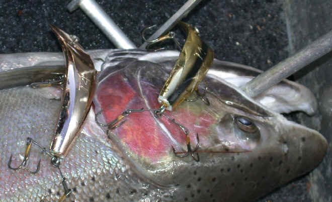 Steelhead strikes, 6 hooked-up and 4 made it to the net. One chewed us off and we released 2 of the 4 fish we did boat. One of the rancorous males John caught rocketed at least 4 feet out of the drink! We averaged about one bite an hour, so the action was decent, but not "red hot." 11/17/03 Gonna be back on the Big Manistee River again today with Warren Knapp and John Johnson. Both of these men have crewed for me on the big lake, with John J. doing most of the duty lately. This is my small way of showing appreciation for the work they have done. I'll betcha you'd like your boss to take you Steelheading on the big river for an employee appreciation day! Check back later this evening to see how we did, and a fresh update. The recent fish and hot lures pictures is exactly what the doctor ordered to brighten-up this website.