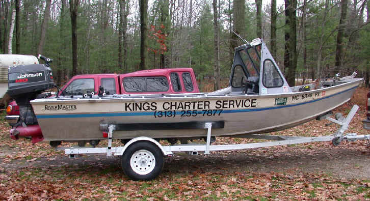 the practice, (after guiding for 18 seasons) a few fish willing to cooperate is all I'm asking for. 11/11/03 I've gotta go to Manistee Tire in the morning, after a new set of skins for the riverboat trailer and my boat goes back on this afternoon. I had problems re-wiring the trailer running the wire inside the trailer frame. I'm plain sick and tried of working on this deal and look forward to tomorrow, or the next day when I get back on the big river. The tackle is almost ready and after re-spooling the reels with new line, I should be in fine order in that department. All fishing details will be attended to today. Fishing is a hellva lot more fun then working, but I'm willing to guess you already figured that out on your own...if not you're in deep, deep do-do! 11/10/03 All the pieces are in place for me to complete my facelift of my 17 foot RiverMaster jet-boat. I'm wiring new lights on the trailer today, installing the new side curtains for the canvas enclosure and mount new cable for the anchor winch. After a quick trip to town tomorrow for new trailer tires this project is a done deal. I'm looking forward to fishing the river reel-soon and by mid-week I should be back on the big river. Maintenance is a pain in the butt, costly and time consuming, but a necessity if you want to fish out of a nice boat.