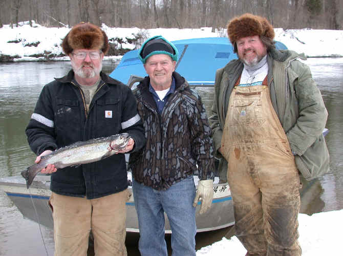 2/25/04  I was at the High Bridge launch ramp yesterday afternoon to greet Capt. Jay and his guests at 4pm.  Larry and Dave fished the river with Jay and ended up with a Steelhead and lost a dandy right before quitting time.  I spoke with Mark, the DNR's catch-reporter and he said, it was maybe a fish per boat and no Steelhead at all were caught, or recorded at Tippy Dam. Click here for Larry, Bud & Dave
