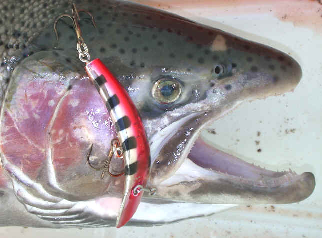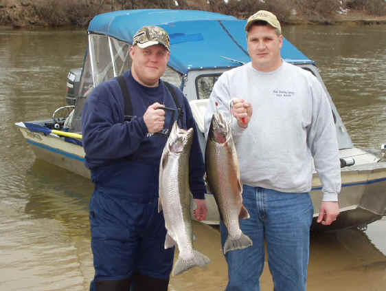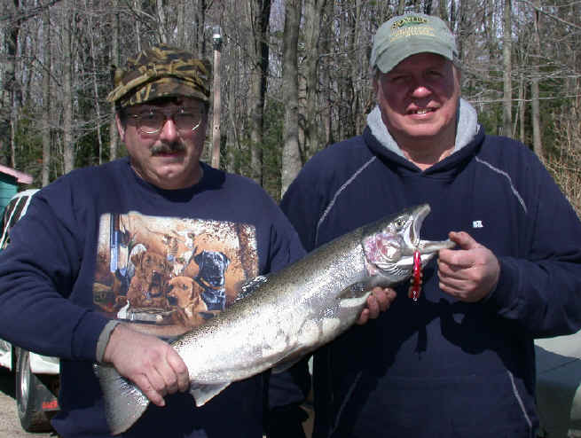 3/21/04  Jeff and Denny stopped my house today with a dandy Big Manistee River Steelhead.  This was perfect for me, because in all honesty, I was hurting for a timely update.  The weather in the first part of the day was perfect for Jeff and Denny with temperatures pushing 50 degrees.  Then around 3pm it turned windy and got cold in a hurry.   Click here for Jeff & Denny    Click here for their hot lure