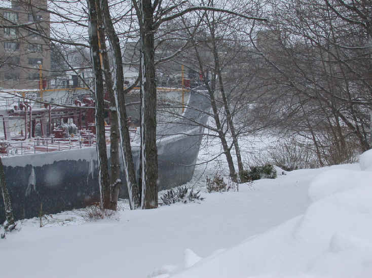 1/28/04  While it slipped my mind for a while, the first freighter of the 2004 season entered the channel in Manistee on 1/23/04.  I've never seen one this early and a tug must have broken the ice, because for a while, the "Ralph Tucker" looked to be stuck in the ice out by the Coast Guard Station.  The ice this ship broke loose, is not gonna do any good for the marinas in the channel, or the ice fishermen on Manistee Lake.