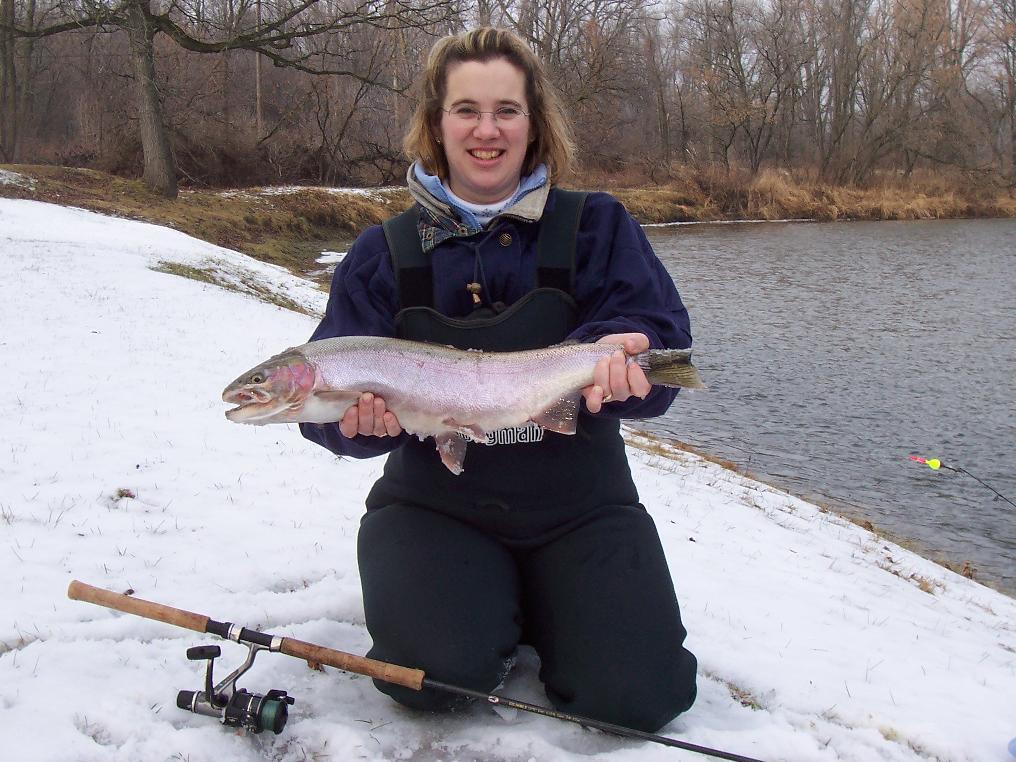 1/4/04  "Getaway" Bob and his wife "got-away" for some Steelhead fishing on the Au Gres River recently. He managed to "hook" two birds with one stone, by catching Steelhead and getting his wife hooked on river fishing too!  Bob is a highly