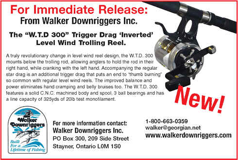 3/9/04  The "big buzz" at the Flint Steelheaders Show was the new under-slung level wind reels from Walker.  This reel has a special trigger to apply additional drag if needed. Be care when you torque down on any fish, because line breakage can always occur.  I'll probably have a few of these reels for demonstration purposes at our symposium which is only about 3 weeks away.  Click here for the Walker Reel