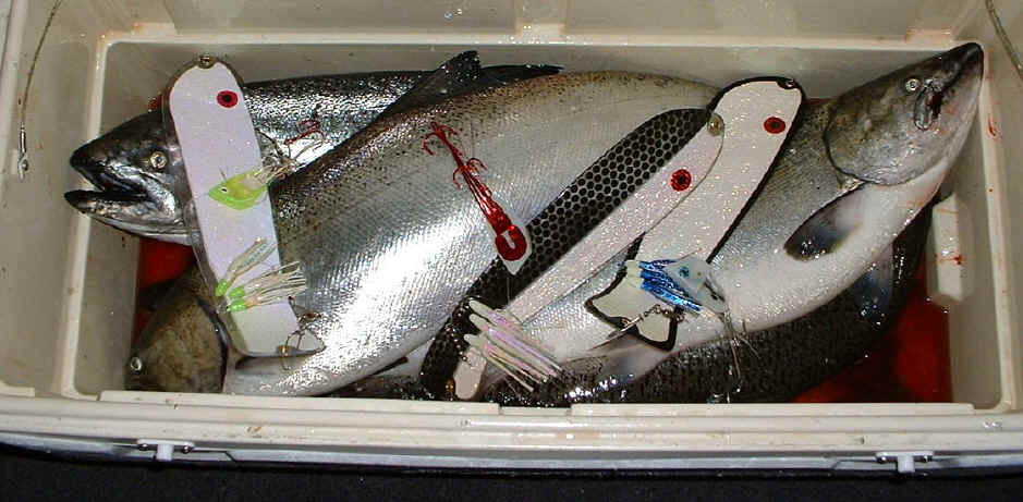Two of the best catches (that I know of on 7/17/05) that came into Solberg's Marina in Manistee were charter operator, Capt. Ed P, and the sport fishing craft, "Capt. Morgan."  Both of these boats had a dozen Salmon yesterday, with fish boxes brimming to the top with good sized adult Kings.  The afore mentioned teams were pulling meat (Fish On Green Label) and my products. Click for Capt. Ed box