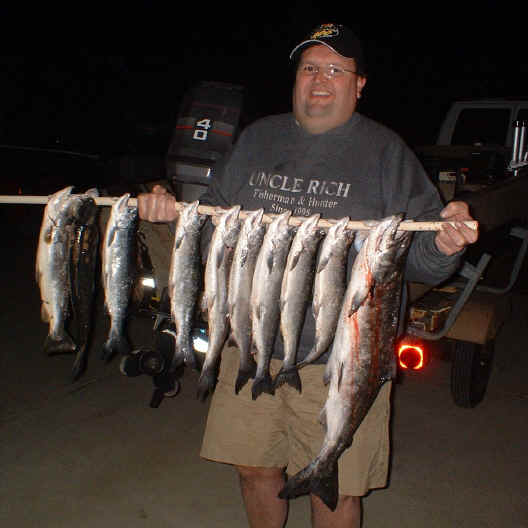 3/31/06   Message board member, Jeff C....aka "Uncle Rich" showed how to get the job done while fishing out of the Port of St. Joe on 3/29/06!   Rich and Kevin had a 2 person 10 fish limit consisting of Coho, Kings and a Brown Trout.  Plus, they caught and released a number of Lake Trout in their fish-fest.  Click for Jeff's catch