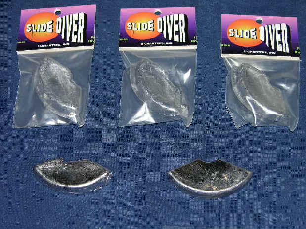 3/9/06  Capt. Randy Even, inventor of the Slide Diver and operates "Sorry Charlie Charters" in Sheboygan, WI has introduced a product to fine tune your diver program.  It's series of weights used in the nose of Slide Divers and Dipsys that come in 2, 3 and 4 ounce sizes.  3 oz. is the standard size, 4 oz. will add more depth and the one I was most interested in was the 2 ouncer.  This lightest size will help keep your divers more controllable in shallow water applications like inside of 20 feet of water, or on harbor patrol for August/September Kings.  Click here for photo of new weight system
