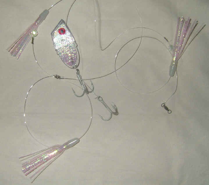 1/2/06  Several new products will be announced during the next few coming weeks.  Items like 4 packs of 3 fly Meat Rigs you can build yourself and save at least 50% of pre-built rigs.  These custom 4 packs will be all inclusive with red treble hooks, bead chains, crimps, fringed Mylar, Magnum Meat Heads & beads to make your own rigs.  These new offerings for the do-it-your-self crowd will be in all my very best colors.  Besides, with about 3 months to prepare for Season 2006, it's a great winter project!