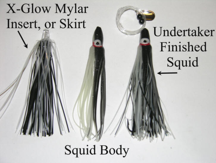 our squids will feature custom tied Mylar skirts/inserts