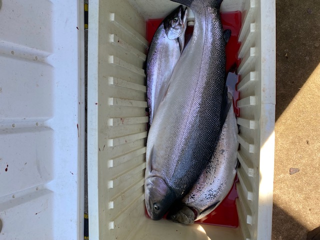 10/8/22  Lk. MI Steelhead and by DNR reports juvenile Kings.  Out over deeper water according to Capn. Kirk that sent in today's photo.  There's a large 17 lb. Steelhead in the box that does not give a good size representation.   Click Kirk's jumbo Steelhead