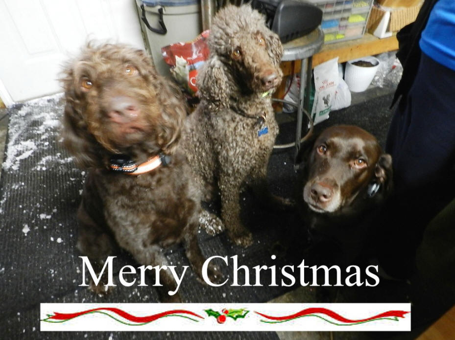 12/24/22  Weather was awful when I took my dogs out yesterday afternoon.  7°, wind and snow didn't seem to effect my 3 dog pack of shop dog Scruffy, sweet Buster (Poodle) and Kat my genius female lab.  My dogs, wife Merlene, and I wish you the Merriest Christmas ever.  We have a lot to look forward to in 2023.  Click for my doggies