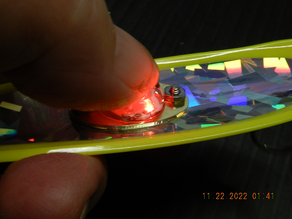 12/5/22  Running a test to find out if the LED lights can actually charge our X-Glow spoons.  This being done in a darkened room with a XG Mean Green as a test subject.