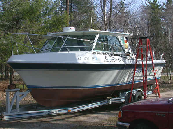 I then took the boat over to Charlie Lott's Garage in Wellston, Michigan on 4/11/03 to pre-prime the oil pressure before the initial firing of the new motors.  Charlie Lott  is a rare breed, being a multi-talented wrench (231) 848-4837.  Snowmobiles, outboards, I/Os, automotive and marine motors pose no problem for his vast and well-known skills.  After an unexpected "minor" problem with the oil splash tray the 350 Crusaders were purring like a contented house cat in short order.  John Johnson and myself spent the next day getting the Cherokee ready for the 2003 season.  General cleaning was needed and the tackle had to be readied.