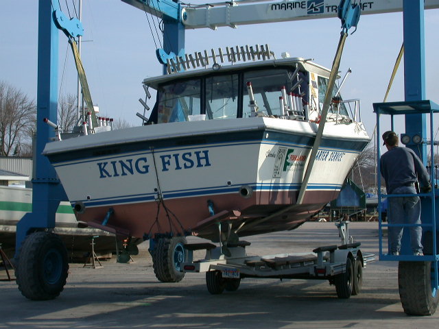 I hauled the boat into Manistee for the inaugural splash of 2003 on 4/14/03, but the boat-hoist was tied up on another project.  Well, to make a long story short we finally got the vessel wet on 4/15/03 and spent most of the day breaking in the new motors.  I put a couple of hours on the motors and kept the rpm's below two grand, then I changed the oil and got the boat up to speed and jumped on plane like it did when it was new.  The new motors have about 50 to 55 pounds of oil pressure at 2800 rpms and about 40 pounds at trolling speed of 700 rpms.