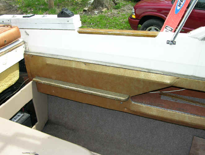 expertise with wood. 5/27/07 Filled the many holes with Marine Tex. Left over stuff from when I had my Cherokee that was still good after 5 years. Laid out final design of a soon to be installed trolling board. Coming up with adequate bracing to deal with the stress of 12 pound cannon balls with 4 foot of leverage requires careful thought. On schedule to get the rig to Bear Lake Marine in 2 days! 5/28/07 Got some work-thru issues with steering, cuz once the main engine is turned off, you have to fight the power steering ram. This does not bode well for running the 15 hp four stroke Johnson OB under trolling conditions. Cleaned up some of the mess in the boat for tomorrow's hike to Bear Lake, MI, which is 27 miles from my place, or the best part of 20 bucks away at 3.50 a gallon. 5/29/07 Taking boat to Bear Lake for controls on the trolling motor and installing liftable trolling motor mount. Oiled the teak battery covers with ATF. It red and far less expensive than teak oil. ATF works as good and lasts just as long, if not longer. 5/30/07 Made the back splash panels to cover the transom area, they came out better that expected. Picked out the new cockpit side combing cushions and they look simply beautiful. Picked up a 20' piece of 7/8" stainless to make the bird pole stanchions and new rocket launcher for the hardtop top. 5/31/07