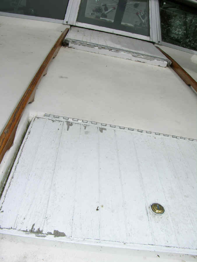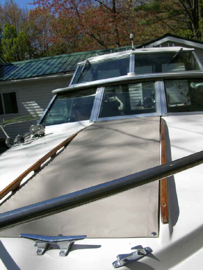 With SR 1979 approaching it's 30th birthday, some of the teak was weathered.  The previous owners chose to paint over the teak.  Found brown paint underneath the white in the above "before" photo.  In my opinion, the paint only makes older beat up teak wood look worse.  Easy solution was to run a strip of canvas the length of the bow.  Man, what a difference!
