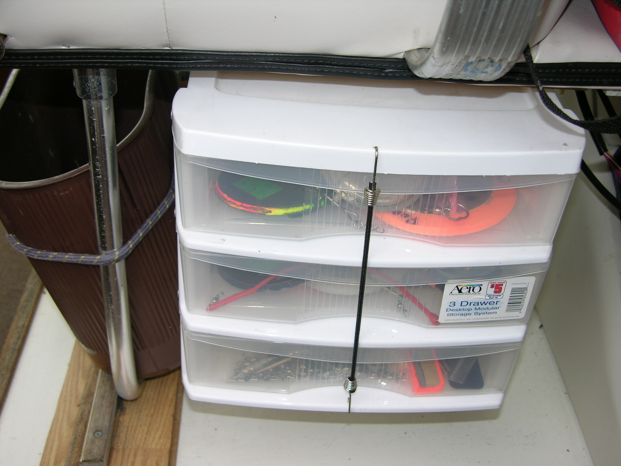 Small boats means small storage areas.  There was a empty spot under the captain's chair that was utilized with a cheap pull drawers to organize divers.  During the course of a season Slide Divers, Deep Sixes, regular and mag Dipsys will all see service.  Having them all located in one spot with snubbers will save time and keep the mess to a minimum.  Sure this isn't a fancy-dancy expensive marine grade boat tackle box, but being out of the way, this K Mart special will do just fine.  Installed a pop rivets to hold it together and a bungee cord to keep the drawers closed.