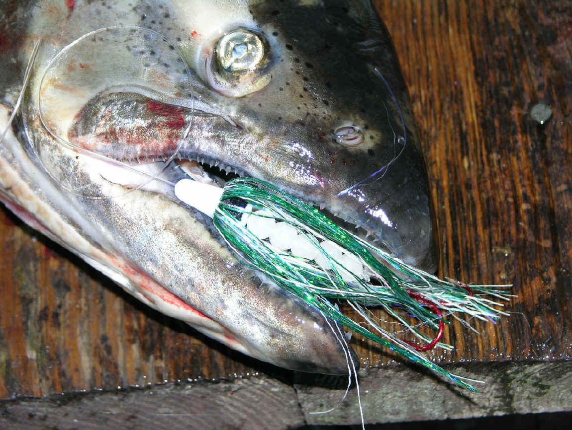 Please scrutinize the photos number 1, 2 and 3.  Other than the obvious advantages of the lethal double trebles, you'll notice in photos 1 and 3 the Salmon that hit flies were more like nibblers.  Being hooked up on their chin and outside of their snout.  King Salmon that whacked our meat rigs fully engulfed the meal.  Thusly, welding to double trebles on the inside of his alewife hole.  All 3 images shows the deadly 6 pack of stickers produced boated fish that might have been otherwise missed!