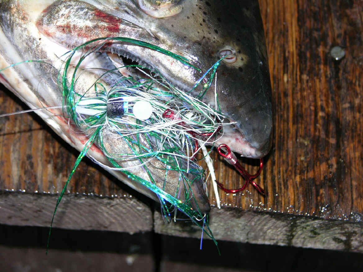 Honestly, I do not fish a lot of flies, but the touchy 2008 season required splitting hairs.  Once was it was established ...meat would only take fish for us in 46 to 38 degree water.  In the warmer water, like 54 to 62 degrees Salmon would whack the BTIs with flies on our divers more aggressively, compared to our meat rigs.  This was a radical departure from the 4 previous seasons.  Reasons could be many and all speculation is purely conjecture.  The reel-facts about 2008 says we were not besieged with big numbers of fish, day-in & day-out.  Especially, if compared to the previous bonanza seasons during the span of 2003-2007.  Sure, there were some easy days in 2008, but you could count them on one paw, ...as far as I'm concerned.