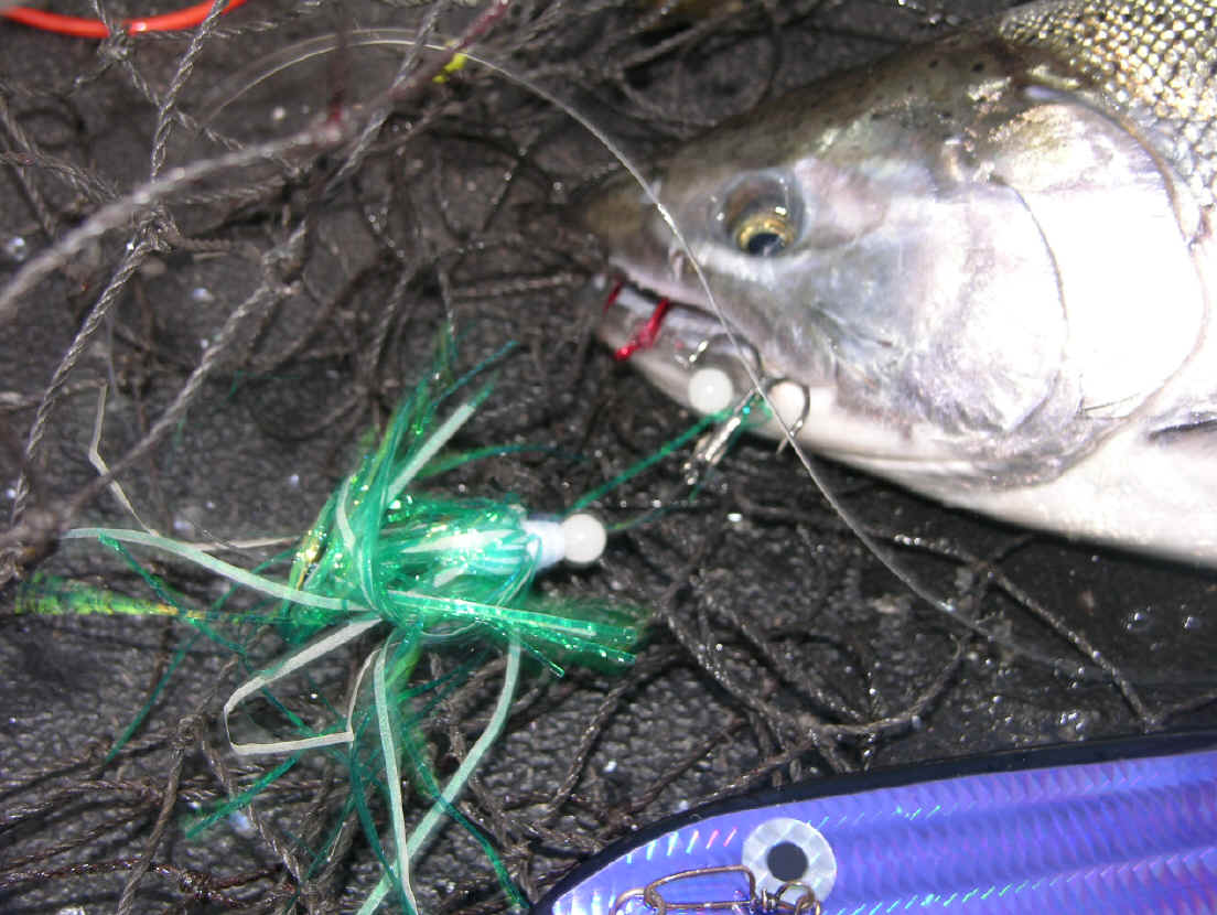 Missing hits on flies is now is a thing of past since we changed over to double snelled trebles.  On 8/31/08 we boated let's say ...one fish out of 4 diver bites.  9/2/08 we wised up and changed over to all double snelled trebles on our flies, same as on our meat rigs.  We didn't miss any hits on our divers hits that day, or the 3 diver whacks on 9/25/08.  Not hooking up hits on our trolling flies is now ancient history since we went to all double snelled trebles on our trolling flies.