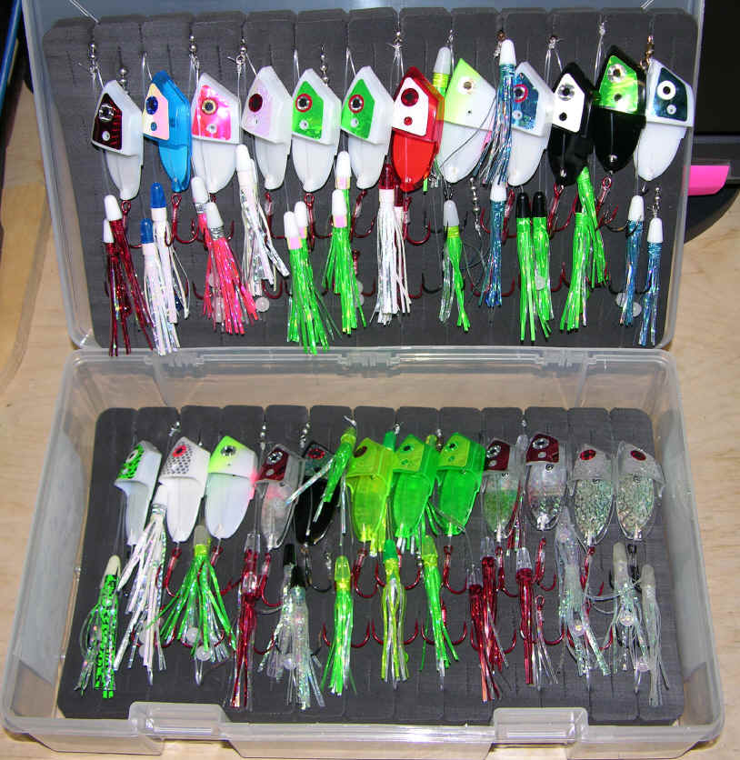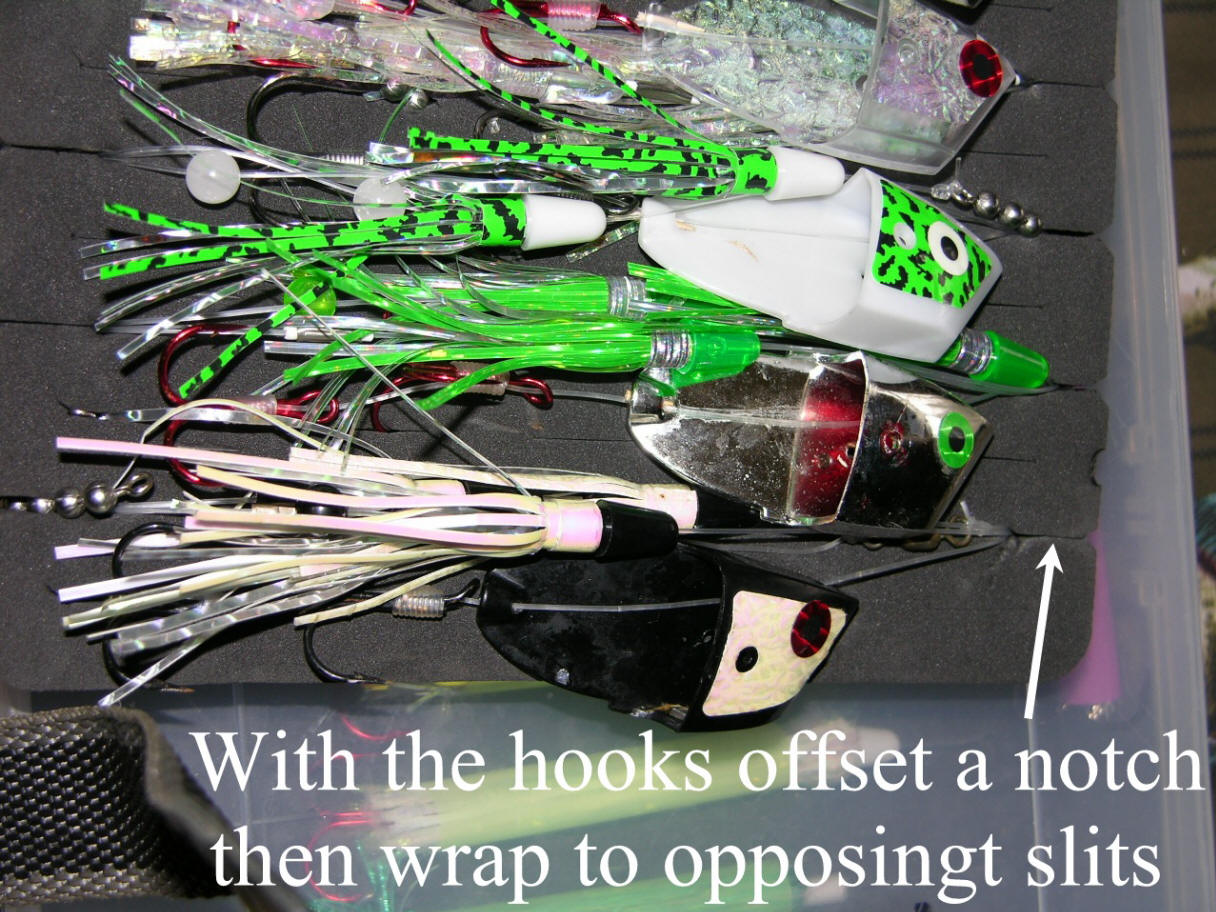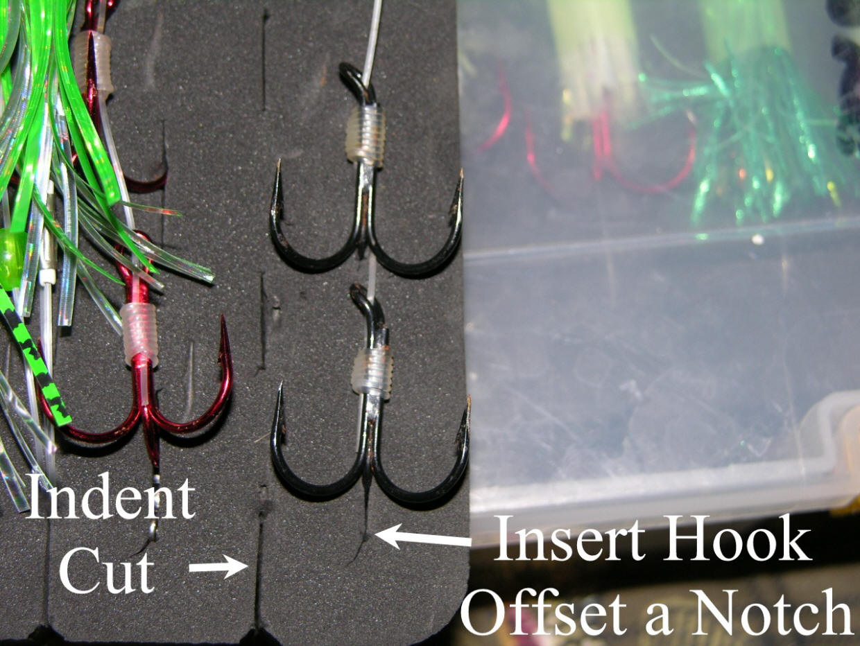 Load the foam inserts as pictured.  Then, place the bottom inserts face down and the top inserts goes face up.  This no hooks are touching and either foam insert/leader holder can be accessed easily. Keeping in mind all hooks must be loaded in the normal face up position and on the same side as the meat heads.  Just press the hooks into the foam at a slight angle, then it's a straight wrap to tame the leader on the meat rig.  Take your time loading and the rewards will far exceed what I charge at the webstore for this awesome storage solution.