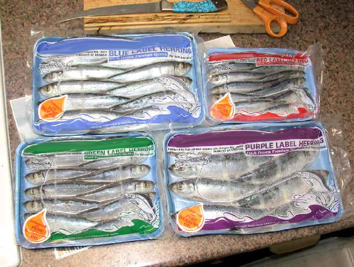 The next size up is Blue Label which is 7 to 8 inches. Purple Label is the jumbo herring measuring 8 to 9 inches. |