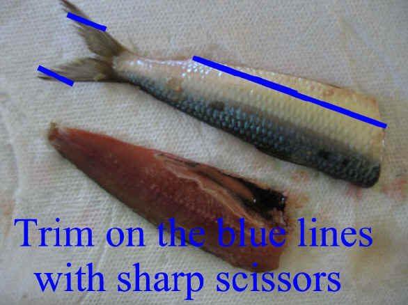 Photo 9. This is the easy part where I add about 16 ounces of water. Like I said, it's not rocket science. I let the thawing process continue in the Zip-Lock for about a hour. Keeping in mind, the scales are also being set even more tightly. Photo 10. Before total thaw has occurred, I start the filleting. I like the herring to be firm and not 100% thawed. I think this helps in making a better fillet in the long run. I've done it when the herring are thawed too, but personal preference is slightly frozen. Photo 11. This is the kinda tricky part, because you have to figure out which side your going to leave the tail fins attached to. I call this the "A" side. The "A" side perfectly matches the bait head holder then. What I mean by matching is the fillet is right side up to the bait head and looks to some extent a little more natural. The "B" side still works, but won't have the tail flipper. Photo 12. This is the angle of the blade, before I turn the knife and slice down thru the herring towards the tail. This angled cut is made directly behind the gills. Tip: You must have a sharp knife to accomplish this task. Remember to use the whole blade, by drawing the blade down and thru the herring, do not to drag the knife. Use the full length of the blade in a smooth effortless cutting motion.