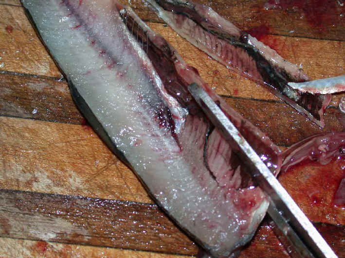 Photo 13. Now, things might get a tad tricky. You need to use scissors now to snip off the head. This is the "A" side we're working on. The "B" side will just be a strip with no tail fin. Photo 14. There's only about of a 5/16s" of an inch of room inside the bait head. By trimming, the bait will easily slide into the bait head holder without looking scruffy. Photo 15. This image shows the snipped off area and how thick (from top to bottom) the herring is. It's my firm belief the backbone being left in assists in a more natural life-like spin, as it stiffens up the fillet. Also, you can see it's far to wide to fit into the bait head holder. Photo 16. You now need to trim off the belly, so the top to bottom measurement is 1 1/16" of an inch. Be sure to trim any tiny rib bones hanging down from the herring's rib cage. |